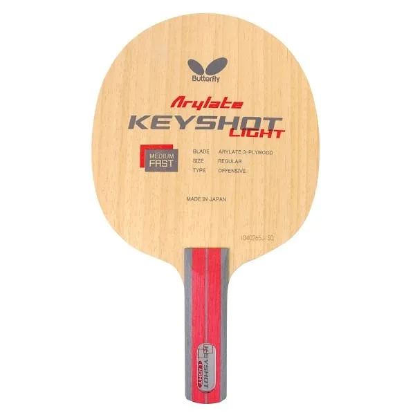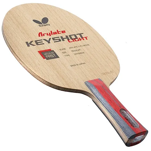The Butterfly Keyshot Light is an exemplary table tennis blade designed for players who prioritize control and finesse over raw power. This blade features a unique composition of three wooden plies combined with two arylate layers, resulting in a construction that balances stability and playability. With a thickness of 6.9mm, it is robust yet lightweight, weighing in at approximately 89 grams. This optimal weight makes it an attractive choice for players seeking a lighter setup while maintaining solid performance.