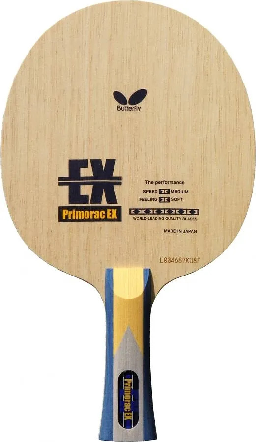 The Butterfly Primorac EX is a high-performance table tennis blade designed for players seeking an exceptional balance between speed and control. This blade features a composition of 5 plies of wood, crafted to enhance precision and responsiveness during play. Ideal for aggressive offensive players as well as those who prefer strategic control, the Primorac EX delivers a speed rating of 8.3, making it suitable for a variety of playing styles.