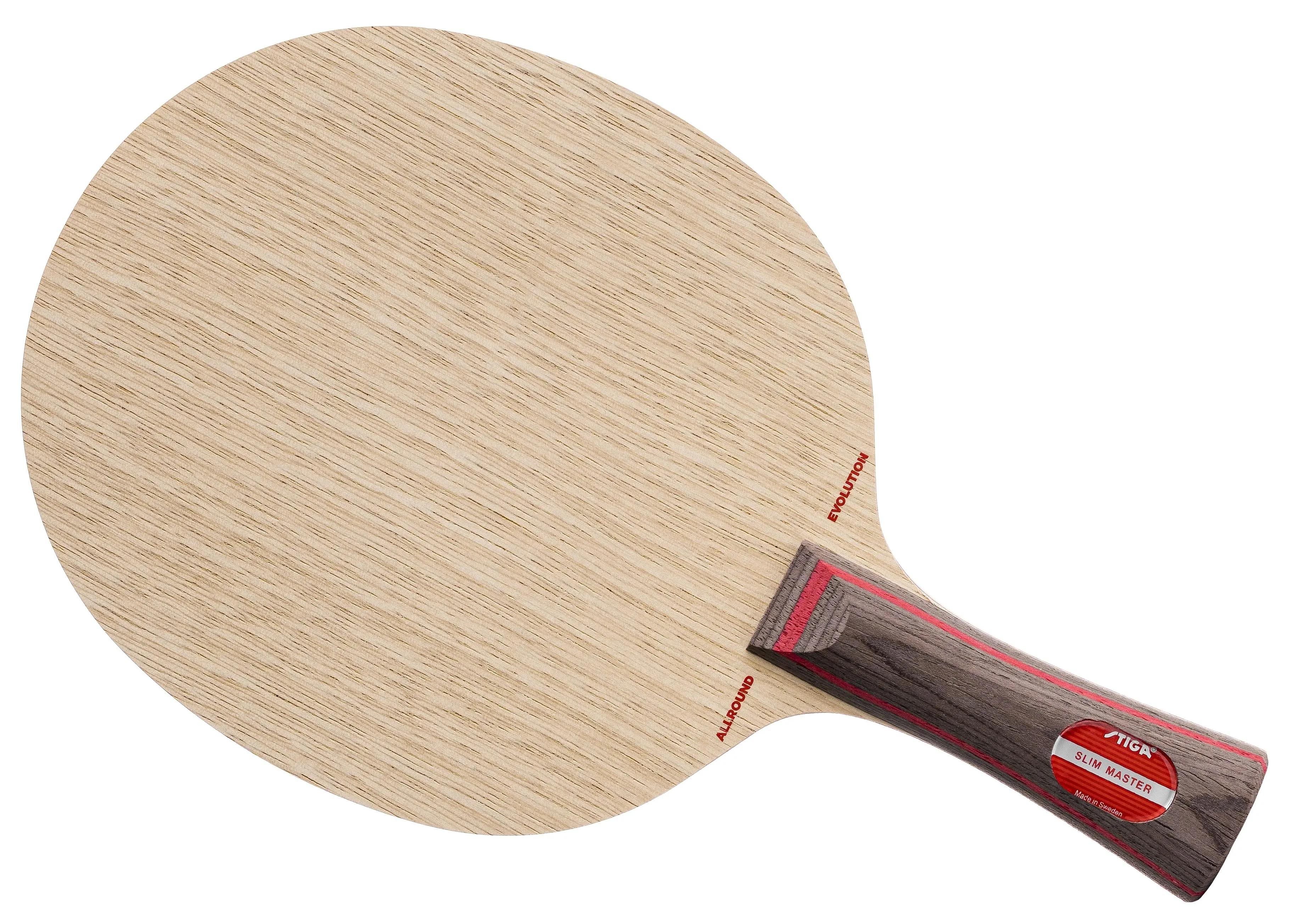 Stiga Allround Evolution Slim is a 6-ply offensive blade with a thickness of 5.8 mm. It is made of桐木(桐木) wood, which gives it a good balance of speed, control, and feel. The outer plies are made of limba wood, which adds to the blade's speed and power. The blade has a slightly concave handle, which provides a comfortable grip.