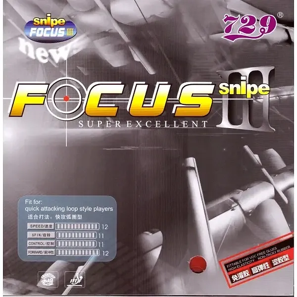 The Friendship/729 Focus 3 Snipe is a versatile, European-style non-tacky table tennis rubber that offers a good balance of speed, spin, and control. It is designed to be a more affordable alternative to premium Japanese and European rubbers like the Yasaka Mark V.